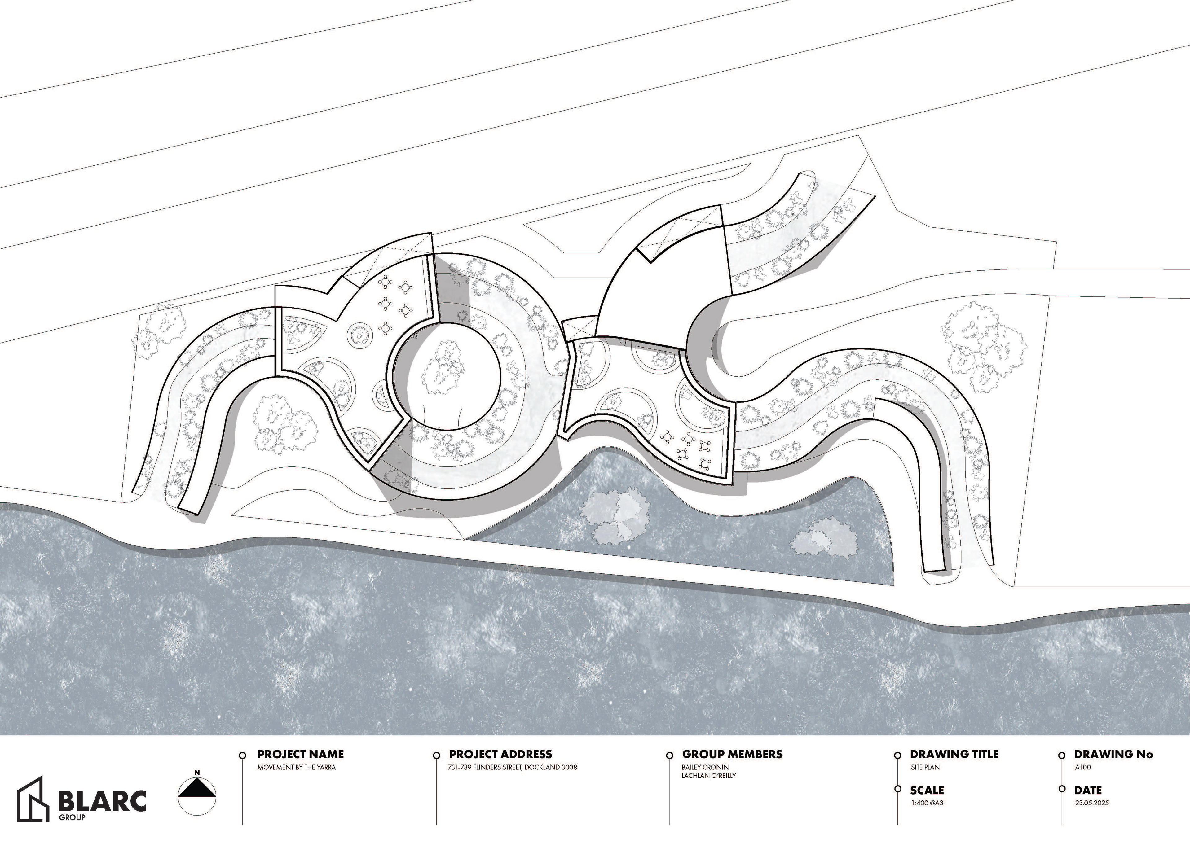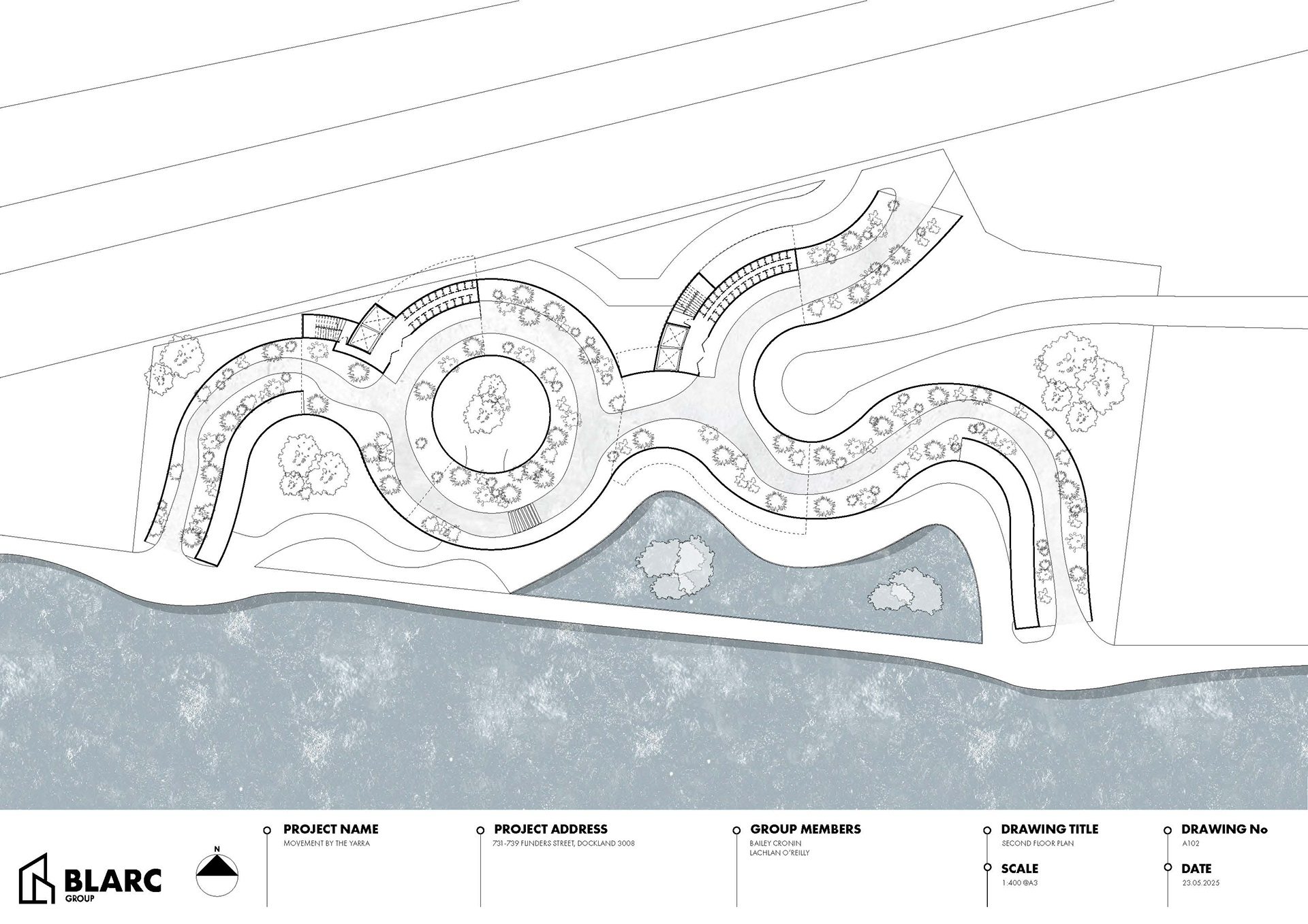 We designed a space along the Yarra River inspired by water and a self-crafted form-finding machine. The machine served as both a conceptual and creative driver, influencing the design’s form in response to its movements. Its interaction with the site’s conditions, including the flow of the Yarra River and the surrounding context, guided the development of the project’s spatial and structural qualities.