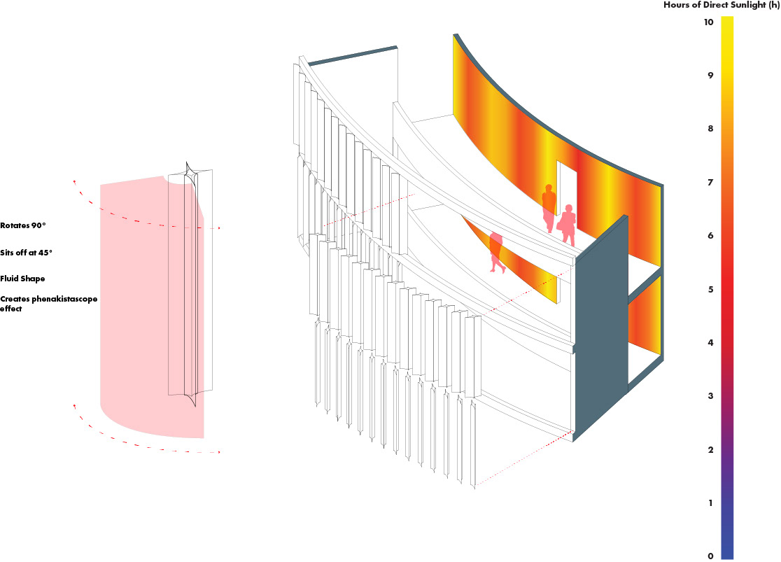 The site was positioned between various forms of movement, which strongly influenced the facade design. On the south side, the facade was opened to maximise city views and waterfront connections. In contrast, the north side faced challenges such as direct sunlight and noise pollution. To address these issues, a kinetic facade was introduced that responded to the site’s dynamic character while diffusing direct sunlight and mitigating noise.